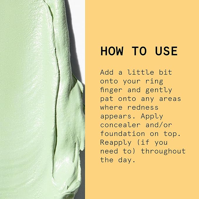 - How To Use: Add a little bit onto your ring finger and gently pat onto any areas where redness appears. Apply concealer and/or foundation on top. Reapply (if you need to) throughout the day.