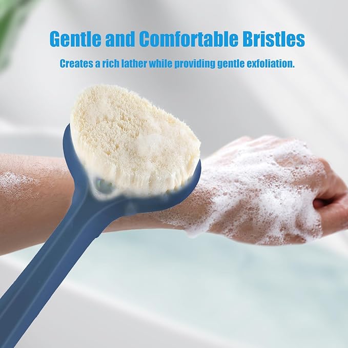 - ANTI-SLIP 17-INCH LONG HANDLE: Tired of slippery shower brushes that slip out of your hand, especially when wet? Our shower brush features a non-slip silicone handle that ensures a secure, comfortable grip, minimizing slippage and giving you better control throughout your shower. The 17-inch ergonomic, curved handle not only extends your reach but also makes it easy to clean even the hardest-to-reach areas of your back and body, all without straining your arms or shoulders.