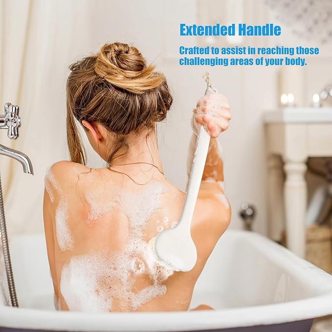 - ANTI-SLIP 17-INCH LONG HANDLE: Tired of slippery shower brushes that slip out of your hand, especially when wet? Our shower brush features a non-slip silicone handle that ensures a secure, comfortable grip, minimizing slippage and giving you better control throughout your shower. The 17-inch ergonomic, curved handle not only extends your reach but also makes it easy to clean even the hardest-to-reach areas of your back and body, all without straining your arms or shoulders.