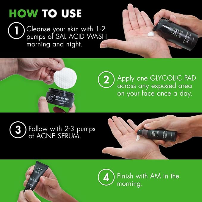 - How to Use: Both morning and night, rinse your face with warm water and cleanse with 1-2 pumps of SAL ACID WASH - spend about 10-15 seconds cleansing your skin, then rinse off with warm water. Pat dry and apply 1 GLYCOLIC PAD once daily, in the morning. Then, with a clean dry face, dispense 2-3 pumps of ACNE SERUM and massage on to your face. Finish with the AM Moisturizer in the morning.