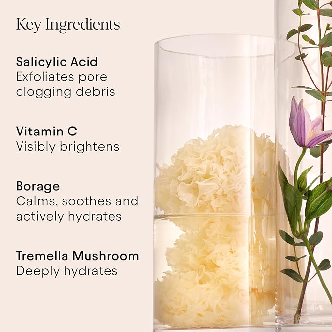 - KEY INGREDIENTS INCLUDE: Borage Extract to calm, sooth & restore skin. Tremella Mushroom hydrates and maintains skin's natural pH. 2% Salicylic Acid (BHA) exfoliates pore-clogging debris. Vitamin C visibly brightens and protects against free-radical damage.