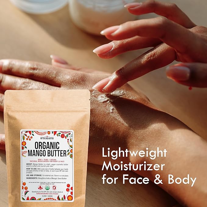 - Organic Mango Butter : Experience the purity of mango butter raw organic unrefined, a versatile ingredient for soap making supplies, a lotion making kit or body butter making supplies. This certified organic raw butter is cold pressed to retain all its natural benefits, making it perfect for a homemade lotion bar, natural body lotion and hair butter.