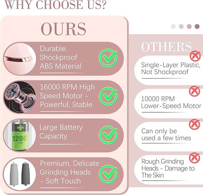 - Upgraded Powerful Motor: Powered by an upgraded, high-speed motor, this electric foot callus remover delivers smooth, powerful, and pain-free performance, safely and effortlessly eliminating tough calluses and dry skin. Treat yourself to a relaxing foot spa experience at home.