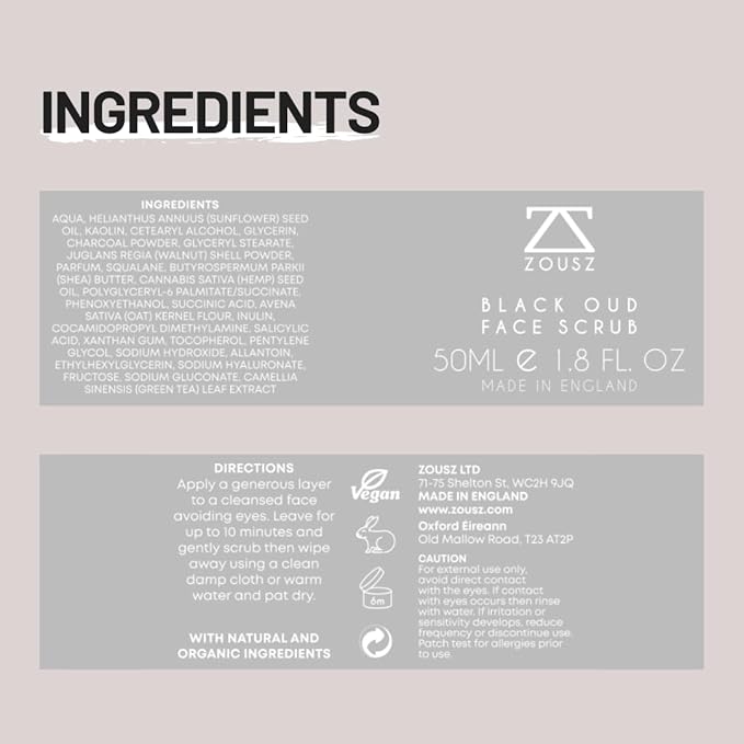 ZOUSZ Black Oud Charcoal Men’s Face Scrub & Mask – Deep Cleansing Exfoliating Clay Face Wash with Activated Charcoal, Salicylic Acid & Hyaluronic Acid – Clears Pores & Revives Skin – 50ml