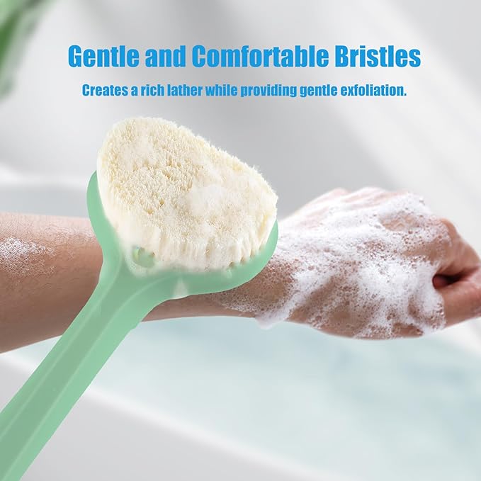 - ANTI-SLIP 17-INCH LONG HANDLE: Tired of slippery shower brushes that slip out of your hand, especially when wet? Our shower brush features a non-slip silicone handle that ensures a secure, comfortable grip, minimizing slippage and giving you better control throughout your shower. The 17-inch ergonomic, curved handle not only extends your reach but also makes it easy to clean even the hardest-to-reach areas of your back and body, all without straining your arms or shoulders.