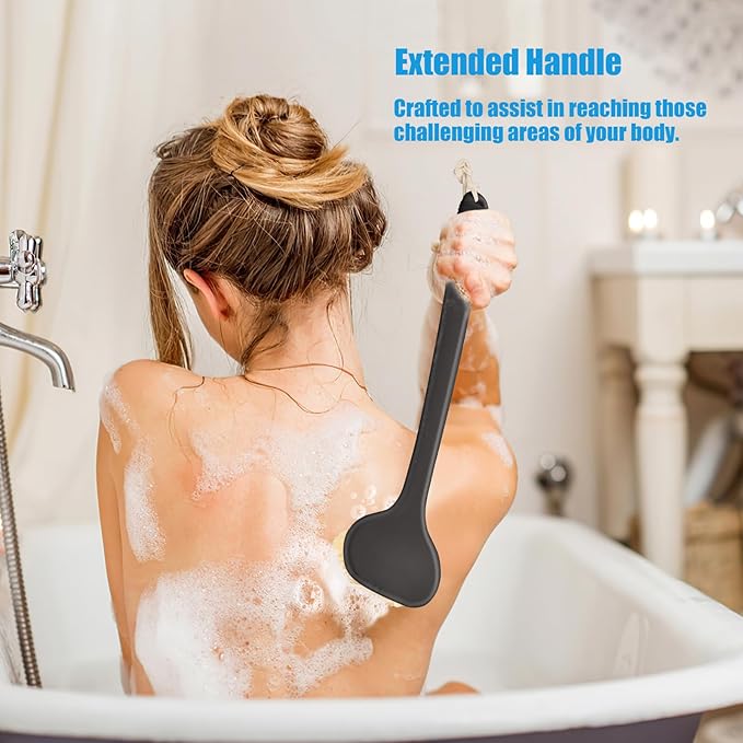 - ANTI-SLIP 17-INCH LONG HANDLE: Tired of slippery shower brushes that slip out of your hand, especially when wet? Our shower brush features a non-slip silicone handle that ensures a secure, comfortable grip, minimizing slippage and giving you better control throughout your shower. The 17-inch ergonomic, curved handle not only extends your reach but also makes it easy to clean even the hardest-to-reach areas of your back and body, all without straining your arms or shoulders.