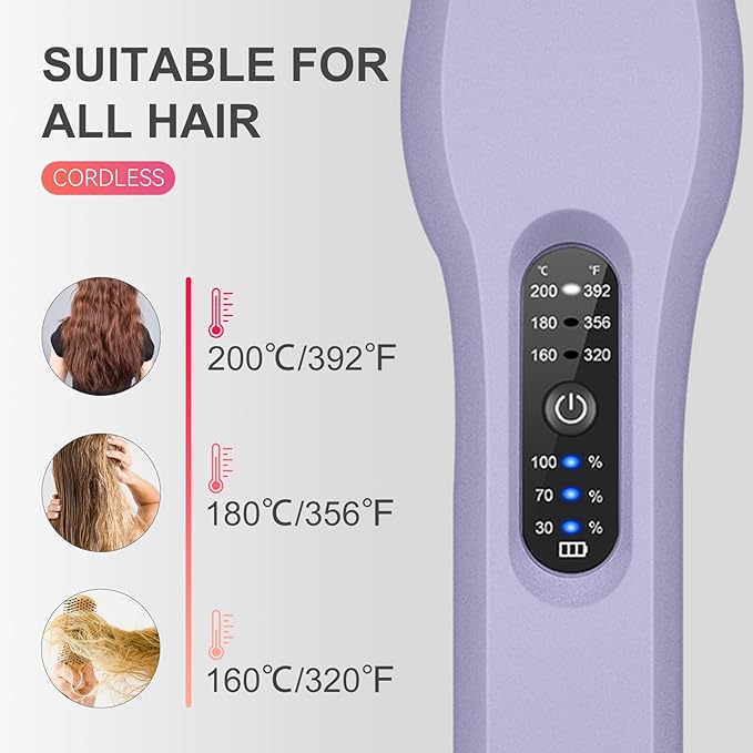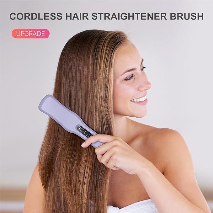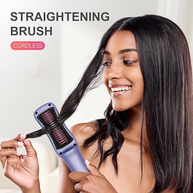 - CORDLESS STRAIGHTENER BRUSH _ The hair straightener brush is cordless and portable hair straightener. No cords, get rid of the tangled cables and make it easy to carry. It features a 3D denser teeth design that helps straighten even the roots of your hair, ensuring that all strands are heated. And less heat damage to hair. Safe Anti, scalding design U-shape flame-retardant plastic rings.