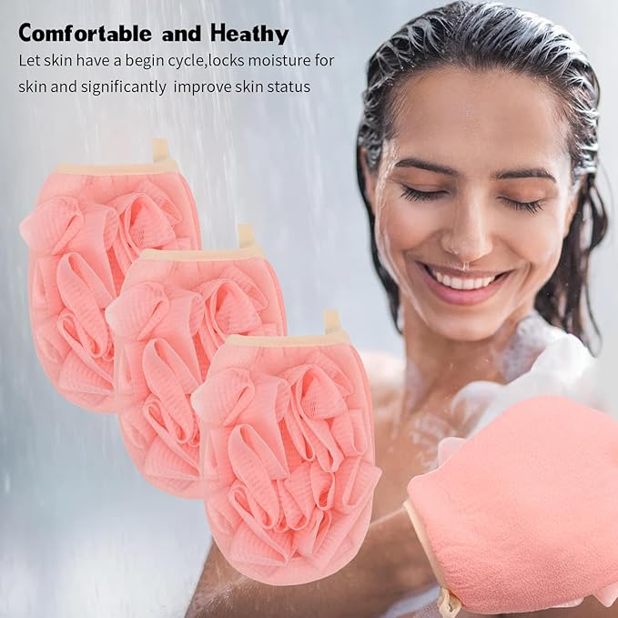 3 Pack Bath Loofah Body Sponge Brushes Loofah Exfoliating Glove Bath Shower Glove with Flower Bath Ball (Pink)