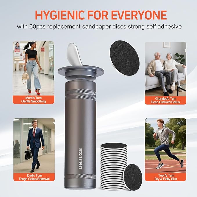 - Designed with a metal body for durability,:this electirc foot filer is built to last 60pcs replaceable sandpaper discs ensure clean and hygienic, one person one disc,making it a cost-effective solution for callus remover for feet.