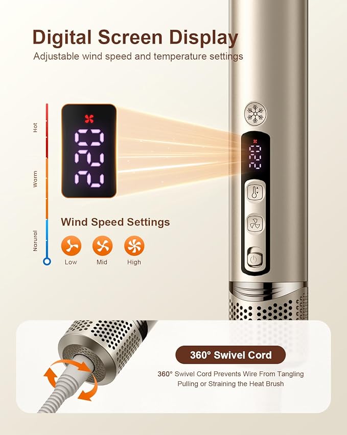 - LCD DISPLAY: Improving the experience during the hair styling process, our hair styling tools is equipped with LCD screen display technology, allowing users to easily and intuitively set temperature levels and wind speed, eliminating the need for guesswork while styling. The button design ensures that the wind temperature settings remain unchanged due to accidental contact. Additionally, the cool shot mode is conveniently activated by touch.