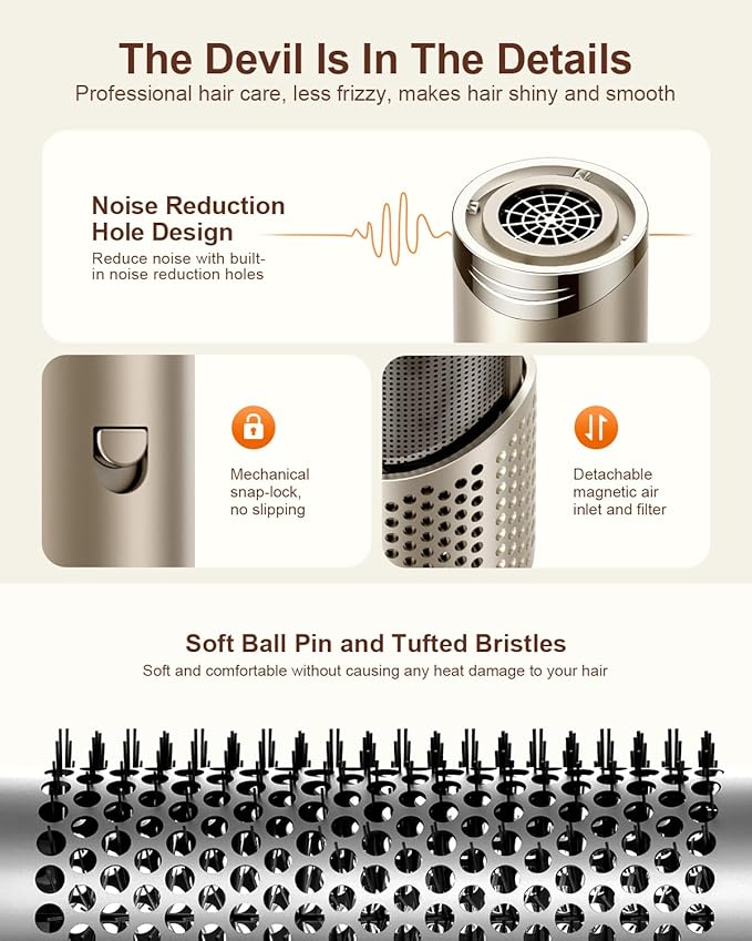 - BECOME A HAIRSTYLING PRO: Master ultra-rapid drying and styling with our hot air brush set, which boasts a high-performance 110,000 RPM brushless motor and a powerful airflow reaching up to 23m/s. This hair dryer efficiently dries your hair in just 5 minutes, significantly reducing frizz and leaving your hair smooth and shiny. The advanced noise reduction structure effectively suppresses noise, thereby enhancing the overall hair styling experience.