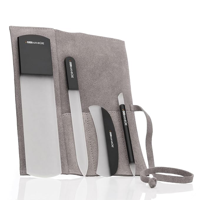 4pcs Manicure Set Genuine Czech Crystal Black Glass Nail File Moon File Manicure Stick Pedicure Foot Care Bar in Beige Suede by GERmanikure