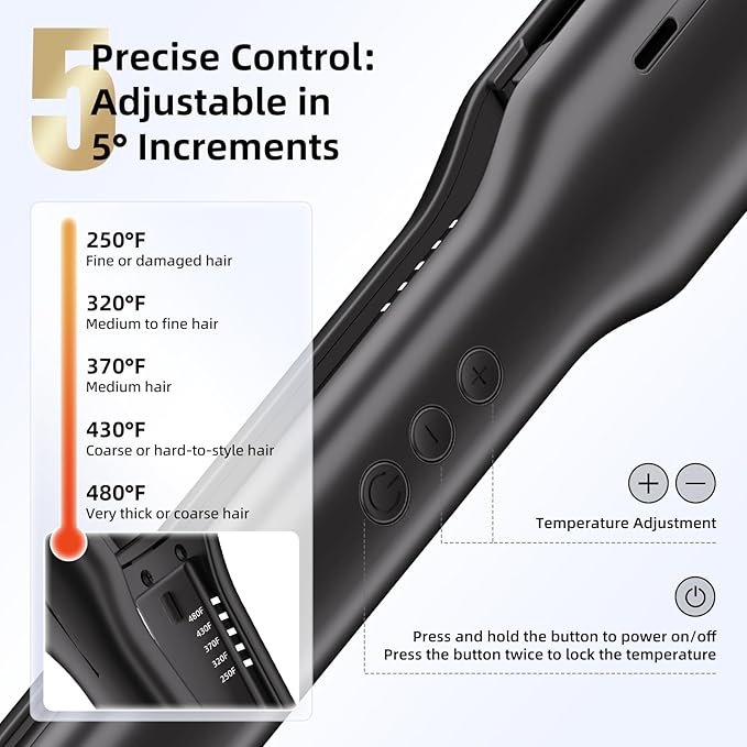 - Fully Adjustable Heat Protection (250°F-480°F): Customise temperature settings safely for any hair type! Fine or damaged hair? Use lower heat. Thick or resistant textures? Dial up to 480°F. Achieve frizz-free straightening, curls, or waves without heat damage – total control for your best style