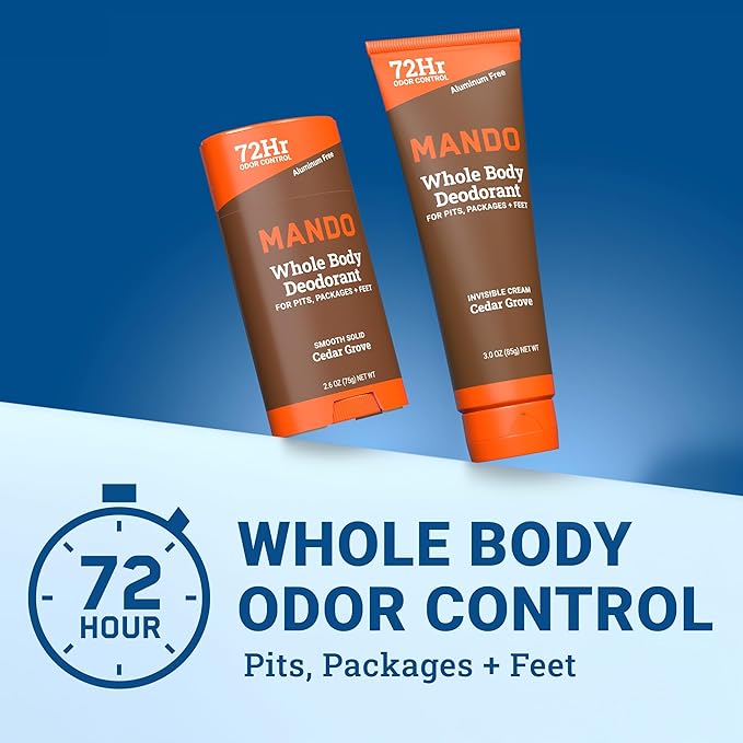 Mando Whole Body Deodorant - Invisible Cream Tube and Solid Stick - 72 Hour Odor Control - Aluminum Free, Baking Soda Free, Skin Safe - 3.0 Ounce Tube and 2.6 Ounce Solid Stick Bundle - Cedar Grove