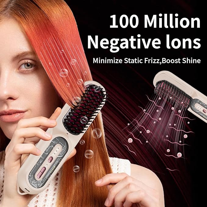 - 【Negative Ions without Damage】Our cordless straight hair brush releases 100 million negative ions when heated. These negative ions can easily enter the gaps in the hair core, repairing your hair from the inside out. Moreover, with a 3D innovative tooth comb double-layer design, the comb can effortlessly slide on the hair without worrying about pulling or hooking it, reducing damage to the hair and making it look healthy and smooth