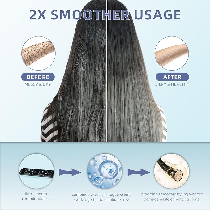 - 𝐒𝐌𝐎𝐎𝐓𝐇 𝐔𝐒𝐀𝐆𝐄: Our hair iron features advanced ceramic plates that provide a healthy finish with 4X less hair damage. These plates ensure superior conductivity for even heat distribution, making it easy to achieve long-lasting hairstyles a whole day. The 3D floating plates prevents snagging and tugging, ensuring a 2X smoother styling experience. Designed to eliminate frizz and enhance smoothness while maintaining hair health. Say goodbye to hair troubles and hello to a sleek look.