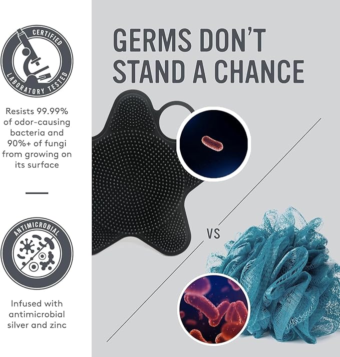 - This Silicone body scrubber added silver and zinc. Takes the worry out of your brush hygiene, will give you a comfortable massage feeling when you use it. Helping you feel rested and relaxed. Meanwhile, exfoliation and scrubbing improve your blood circulation and cell renewal. Suitable for men, women, baby and all.