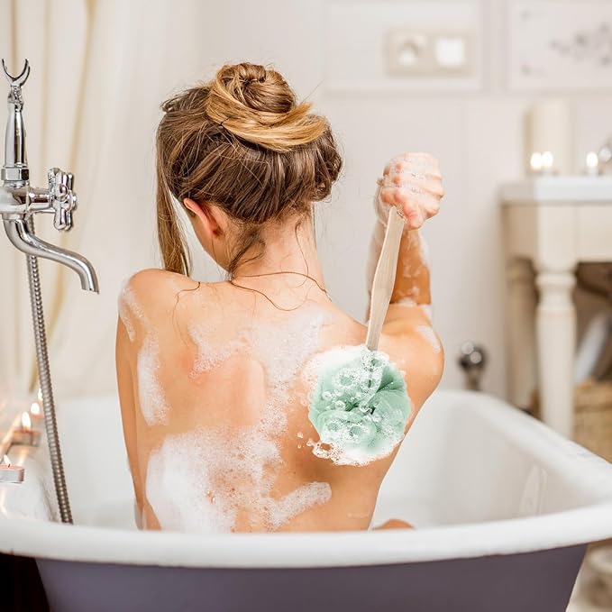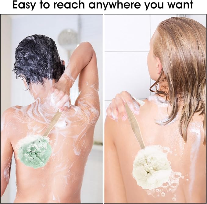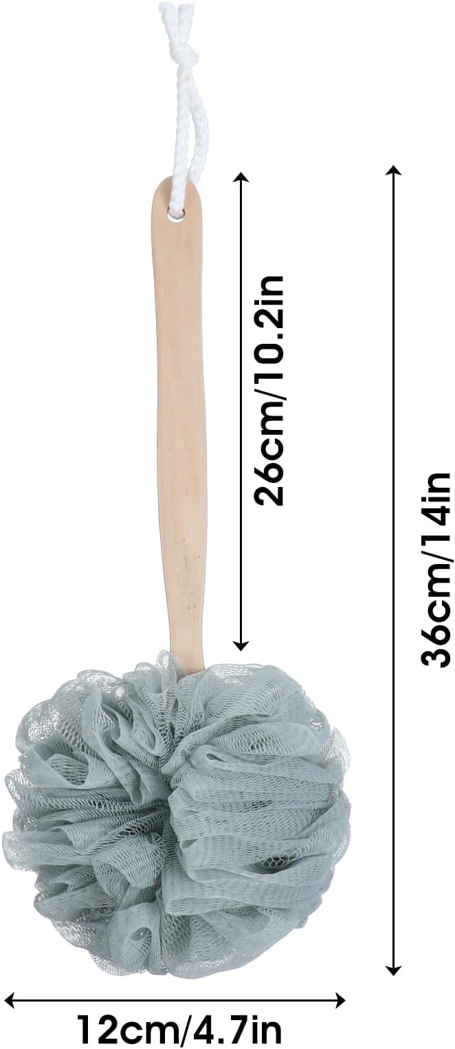 - Long handle with solid grip οΌThis 14" long handled loufa back scrubber will help you wash even the hardest to reach places. The textured rubber grip provides a comfortable and secure, non-slip grip.