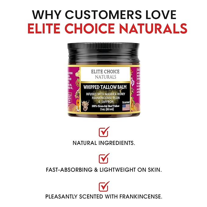 - ELITE CHOICE NATURALS WHIPPED BEEF TALLOW FOR ALL SKIN TYPES: Crafted from 100% grass-fed beef tallow and enriched with organic oils including olive, rosehip, and jojoba, this whipped balm is infused with raw Manuka honey, saffron, frankincense resin, calendula, and chamomile petals. Designed for face, neck, lips, hands and body. it deeply nourishes and hydrates, leaving skin smooth, soft, and refreshed, made with natural ingredients, free from harsh chemicals.