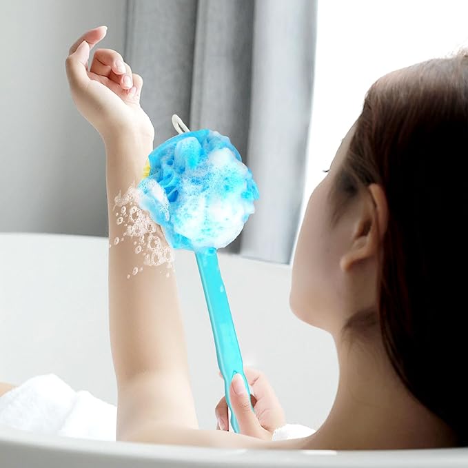 - [Foaming Effect]The loofah sponge with handle has dense and fluffy meshes, which can create rich fine foam with only little body wash. With the body shower loofah scrubber gently massages to leave you with smoother, softer skin.