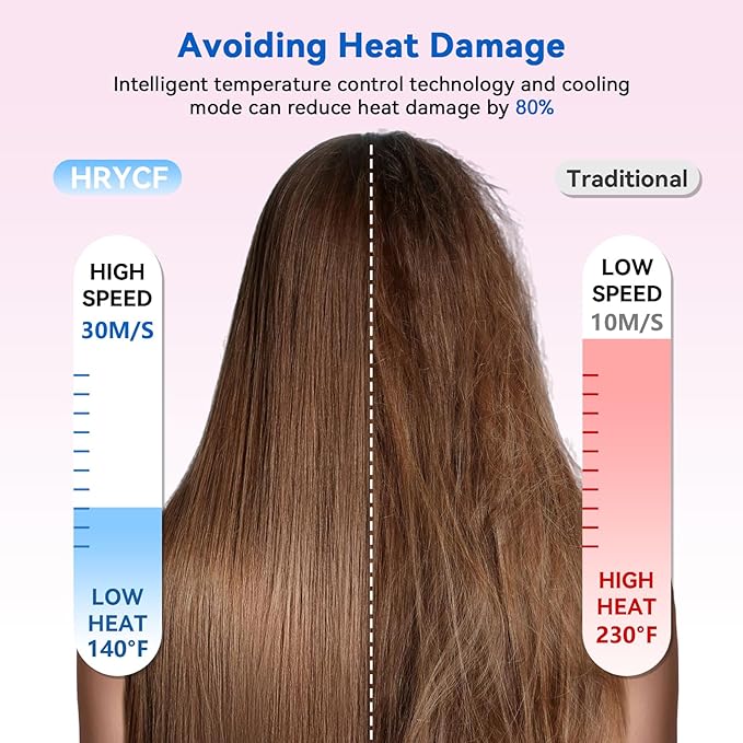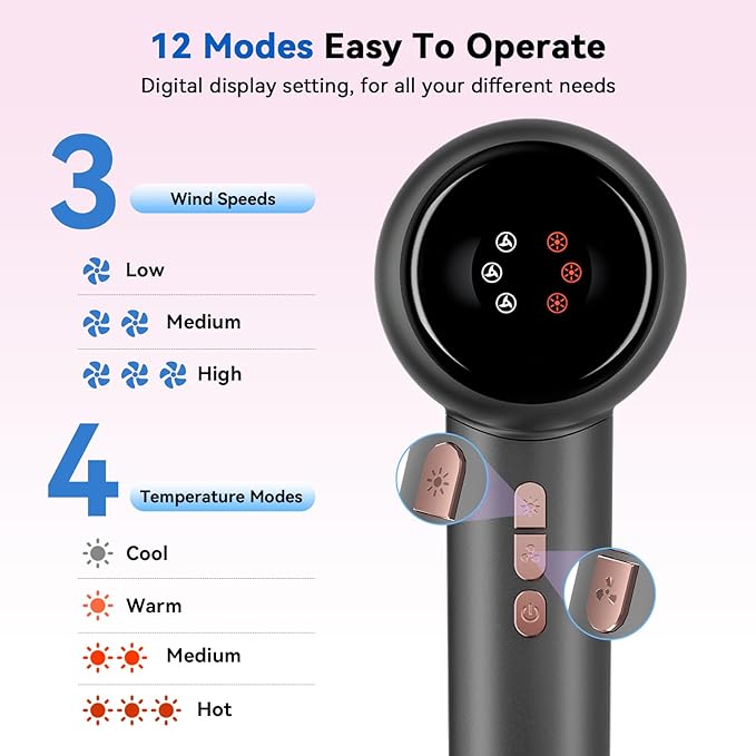 - Heat Damage Protection: This revolutionary hair dryer features precise 140°F heat control technology, utilizing strong, high speed airflow instead of extreme heat to effectively reduce heat damage by up to 80%. With 12 settings (4 heat levels: Cold/Warm/Medium/Hot, and 3 airflow speeds), it offers precise control for all hair types and styling needs