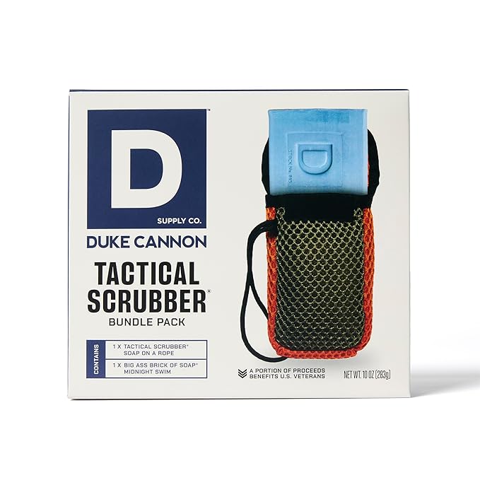 - Duke Cannon Soap Bar + Tactical Scrubber - At 10 oz., 3x the size of typical men's soap. Triple-milled for superior quality, it provides a lather that cleanses without drying. Perfect for hardworking men who want healthy skin and a fresh scent.