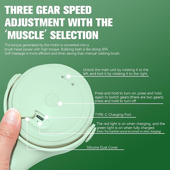 - [Smart Speed Control] : With two adjustable speeds, this shower brush can customize the cleaning experience to your skin type and requirements, providing personalized care and comfort during use.
