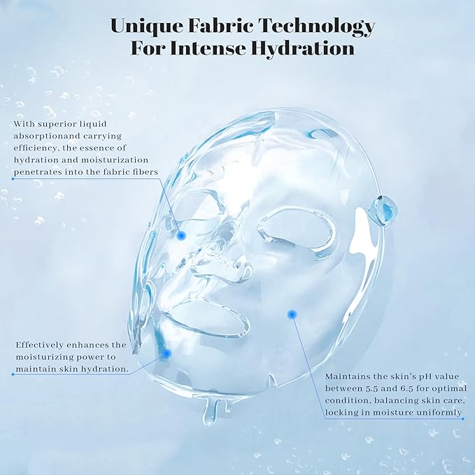 - ICEFLAKE MASK FABRIC : With superior liquid absorption and carrying efficiency, the essence of hydration and moisturization penetrates into the fabric fibers, maintaining the skin's pH value between 5.5 and 6.5 for optimal condition, balancing skin care, locking in moisture uniformly, and effectively enhancing the moisturizing power to maintain skin hydration.