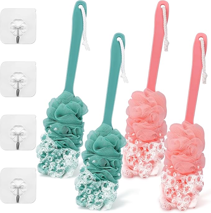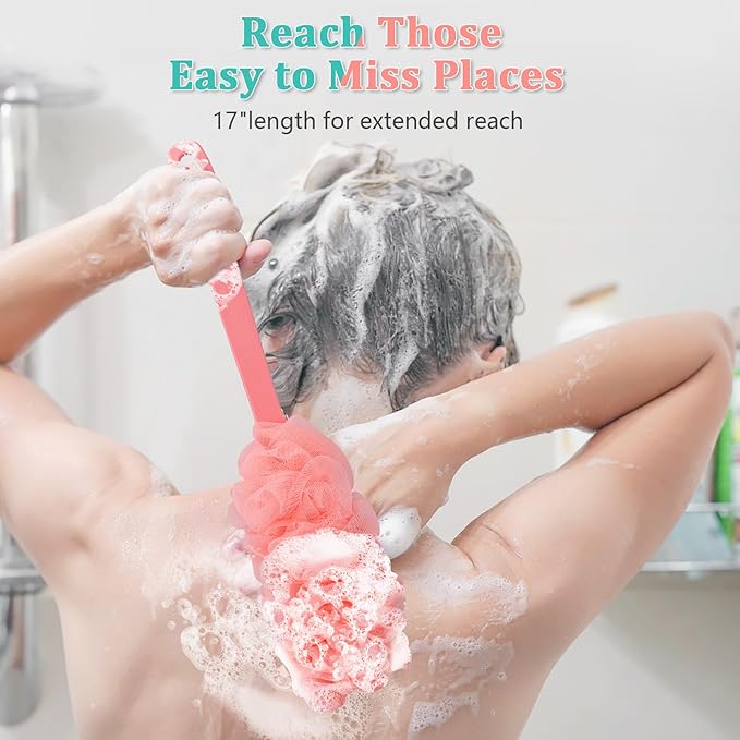 4Pack Back Scrubber for Shower Loofah with Long Handle, Shower Brush for Body, 17″ Loofah on a Stick for Men Women Bathing Accessories, Scrubber Sponge for Exfoliating Bath Brushes (Pink & Green)