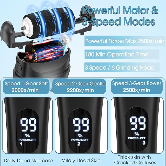 - Professional 3 Speeds Adjustable: Electric foot callus remover has 3 speeds, Effortlessly toggle between Gentle/Standard/Power modes with triple-speed gear system, perfect for sensitive skin or stubborn calluses. By touching the touch button, speed switching is finished. One-touch control - no hand fatigue like manual scrapers!
