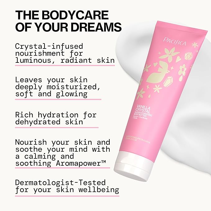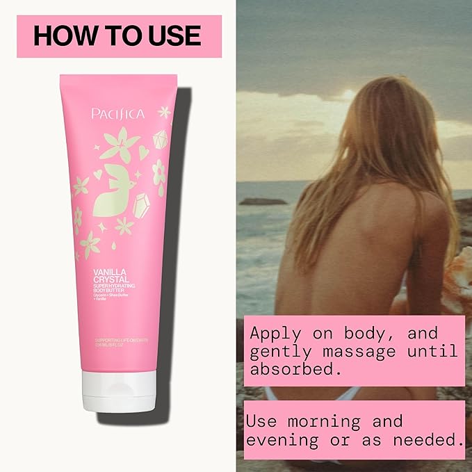- FREE OF HARSH CHEMICALS CLEAN, VEGAN & CRUELTY-FREE: Pacifica’s Vanilla Crystal Body Butter meets strict clean beauty standards: 100% vegan, cruelty-free, dermatologist-tested, and formulated without parabens, phthalates, sulfates, synthetic fragrances, or mineral oils. Ideal for sensitive skin, it’s gentle yet effective hydration you can feel good about. Elevate your skincare routine with ethical, clean ingredients for healthy-looking, radiant skin.
