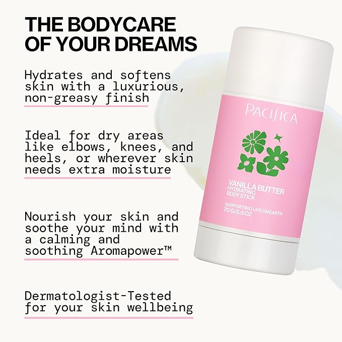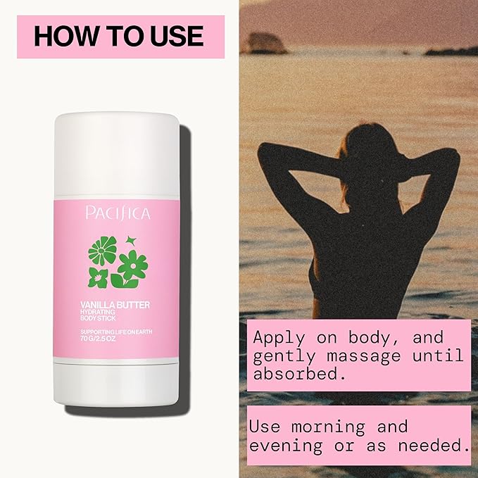 - CLEAN BEAUTY FORMULA: Pacifica’s Vanilla Butter Hydrating Body Stick is formulated to strict clean-beauty standards, 100% vegan, and cruelty-free. Free from parabens, phthalates, sulfates, mineral oil, and synthetic fragrances. Gentle and suitable for all skin types—including sensitive skin—this solid lotion balm provides effective hydration without harmful additives. Embrace healthy, beautiful skin with skincare you can trust and ingredients you'll love.