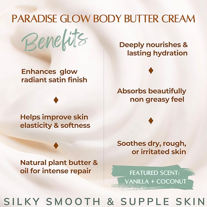 - SKIN-SOFTENING, NOURISHING RESULTS Your softness era starts here. This Body Butter Cream wraps your skin in lasting hydration while helping to restore smoothness and elasticity. It melts into dry areas, softens rough patches, and keeps your body feeling touchably smooth all day long. Use it daily to keep your skin buttery, balanced, and beautifully cared for.