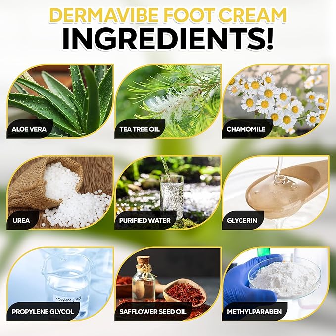 - SAFE & EFFECTIVE – Made with high-quality ingredients, Our Dermavibe urea cream is free from parabens, artificial dyes, and harsh chemicals, making it safe for all skin types. Designed for those with extremely dry, cracked, or callused feet, our advanced formula delivers visible improvements with regular use.