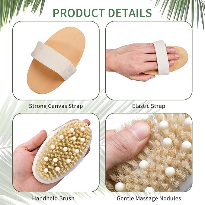 - Well-Crafted Natural Shower Scrubber: This dry brushing body brush is made of natural bristles, featuring a smoothly polished wood handle, soft massage nodules, and a canvas hand strap for easy handling; The balanced firmness makes your skin feel soft and glowing while providing a soothing massage