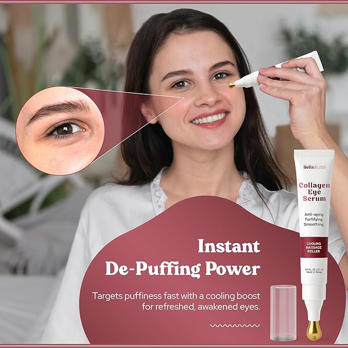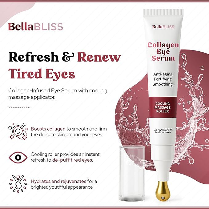 BellaBLISS Collagen Eye Serum with Cooling Massage Roller, Anti-Aging, Hydrating Under Eye roller for Dark Circles, Puffiness, Fine Lines, Wrinkles โ Made in Korea 0.67 FL OZ / 20ML - Pack of 1