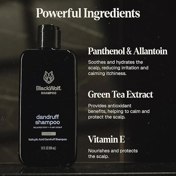 - Anti Dandruff Shampoo: Experience the ultimate in scalp care with Dandruff Shampoo by Black Wolf for men. Formulated with Salicylic Acid, this shampoo works up a rich, cleansing lather to control dandruff, itchiness, and alleviate irritation. 14 oz bottle.