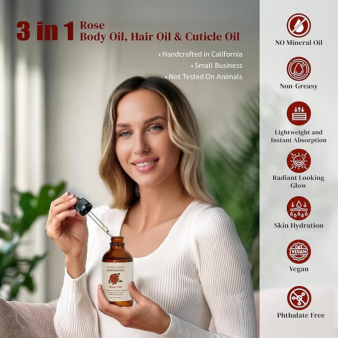 - Rose body oil for women – a hydrating body and hair oil made with jojoba, sweet almond, vitamin e, and rose oil to restore softness and glow.