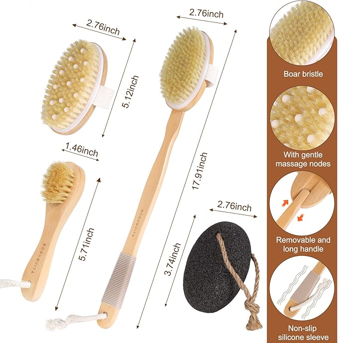 Dry Brushing Body Brush Set- Wooden Long Handle Body Brush Set with Pumice Stone & Face Brush, Boar Bristle Body Bath Scrubber Brush for Lymphatic Drainage & Cellulite, Detachable