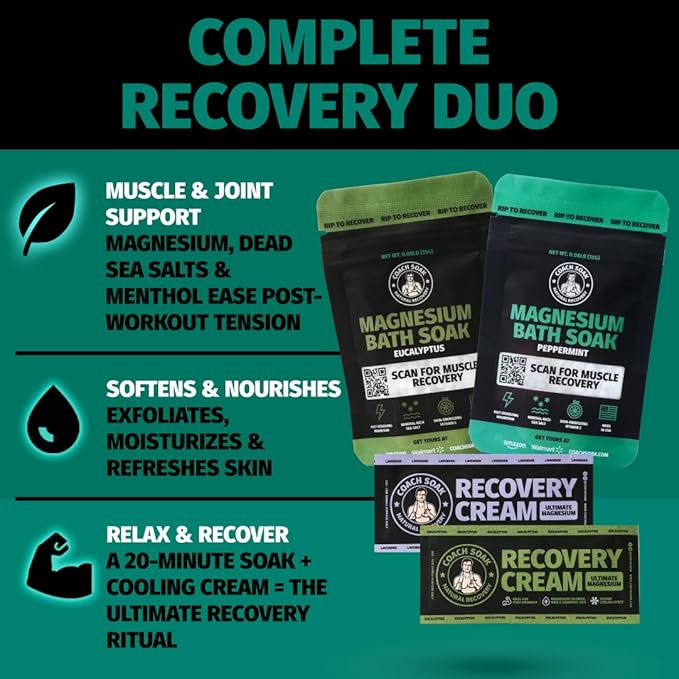 - Rejuvenating Coach Soak: Experience the invigorating benefits of Coach Soak's Magnesium Bath Flakes & Lotion Trial Pack, designed to support athletic recovery. Infused with magnesium flakes and menthol, it revitalizes and refreshes after intense workouts