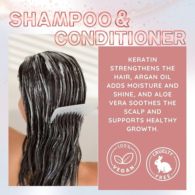 - Dual-Action Hair Therapy: Infused in both the shampoo and conditioner, Moroccan Argan Oil, Aloe Vera, and Keratin work in harmony to deeply nourish, repair damage, strengthen hair fibers, and restore silky softness and vibrant shine from root to tip — leaving your hair visibly healthier and stronger with every use.