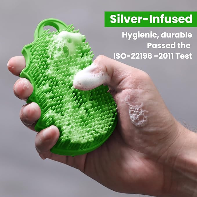Silicone Body Scrubber Silver-Infused Dual-Sided 3-in-1 for Shower, Body Cleaning+Massage+Exfoliator Body Brush Buffer for Men and Women, Silicone Loofah, Non-Slip Handle (Green)