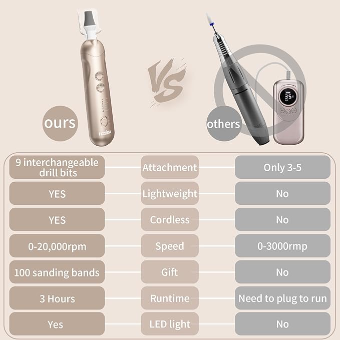 - 360°LED light & Cordless & Portable: If you tired of messy cords and heavy Power Machine, Then your search stop !!! Hoxida Cordless nail dril machine is lightweight, and portable with you wherever you go, professional nail file with 360°LED light, provide you a surrounded clearer view of your grinding area, more efficient and professional for manicure and pedicure home salon use, or travel , you can do a spa hand and foot care experience at anytime anywhere you want.