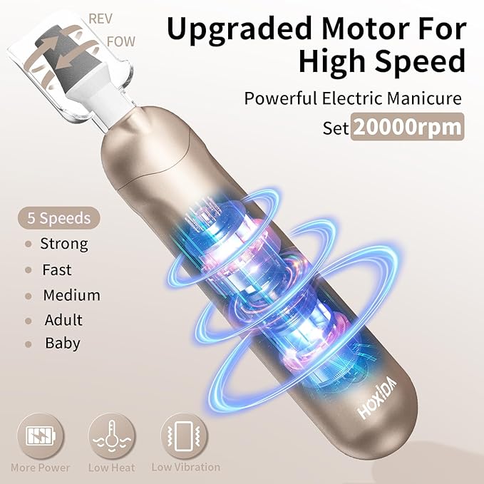 - Sturdy, Low Noise, Low Heat : Hoxida manicure and pedicure tools kit is built to last, with a powerful yet quiet motor with smart heat dissipation, keep the pedicure drill machine is in low noise, low heat while using it. a perfect home pedicure manicure kit for doing your own mani and pedi.with ergonomic body design for comfortable holding, speed and direction controlling. Easy to use, enjoy a salon-quality professional manicure pedicure at home.