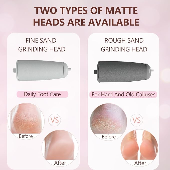 - 【2 Grinding Heads】 Electric callus remover with Two roller heads: One fine sand grinding head use for daily care, One Rough sand grinding head can remover rough dead skin. You can choose suitable grinding head according to the skin to care. smooth pedicure tools replacement heads operation is very simple, and these grinding heads are waterproof and easy to clean. smooth pedicure wand.