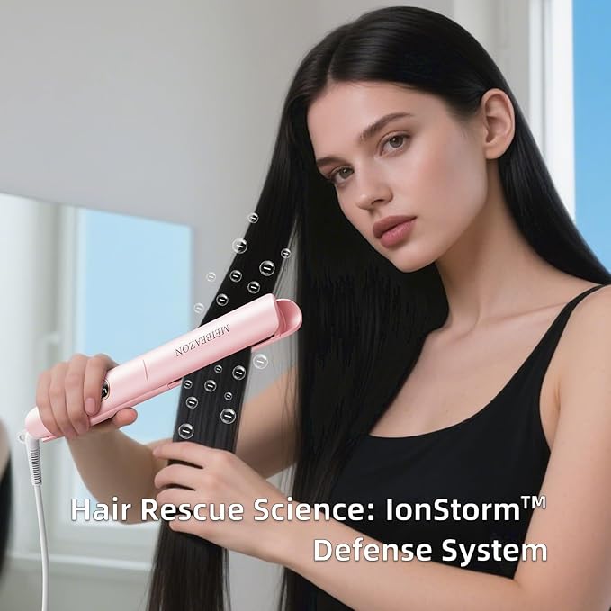 - [Negative Ion Technology for Frizz-Free Shine] This Flat iron hair straightener emits negative ions to neutralize static and seal hair cuticles, locking in moisture for 48-hour frizz control and salon-level shine. Achieve silky-smooth straight hair, bouncy curls, or beachy waves—all without heat damage or dryness