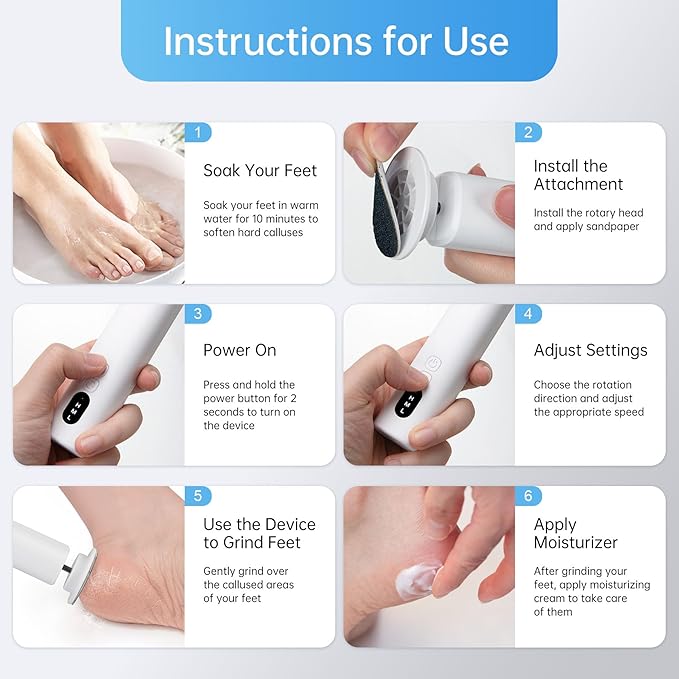 - 【6 Speeds Customized for Your Feet】From touch-ups to deep care—low speeds (L, M) for sensitive areas or gentle polishing, medium speeds (H, HL) for regular dead skin maintenance, and high speeds (HM, HLM) for tough, thick calluses. It's like having a personal foot care specialist—adjust, smooth, and go, no salon appointment required