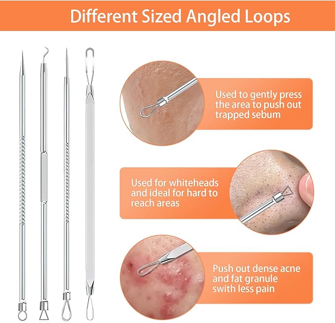 - 20-Piece Multi-Purpose Blackhead Removal Tool, Including blackhead tweezers, Pimple tweezers, Comedone extractor tool, Curved hook tweezers, Small ring acne needles, Double ended pressure ring needles, Acne needles, Deep cleansing needles, Whitehead extractor tool, And zit popper tool.