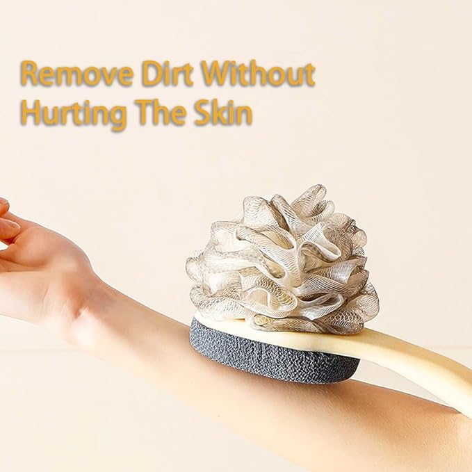 - 【Multifunctional Design】The shower brush has two cleaning effects,one is a fine mesh rubbing ball,and the other is a matte rubbing cloth.The handle of the body brush is built with a hidden foot rubbing tool,which can remove dead skin on the feet and meet the whole body cleaning needs.