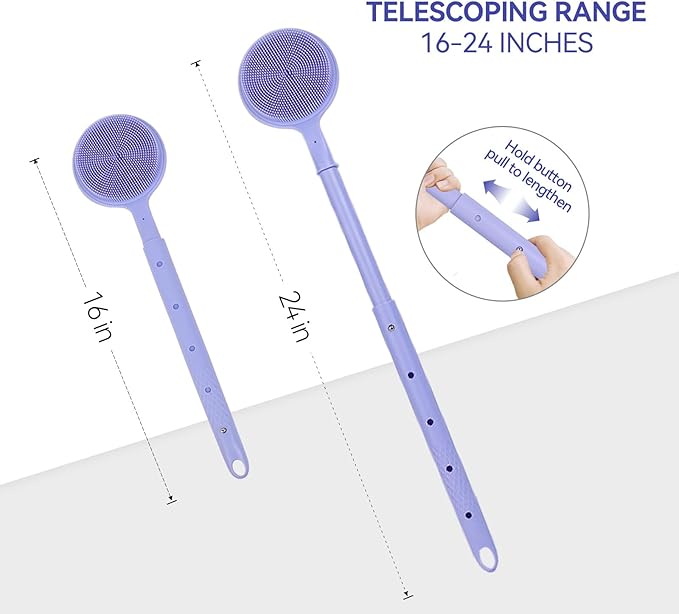 Back Scrubber for Shower, (16-24 Inch) Extendable Bath Brush Long Handle for Shower, Silicone Body Scrubber with Handle, Back Brush for Shower Men and Women,Easy to Clean (Purple)